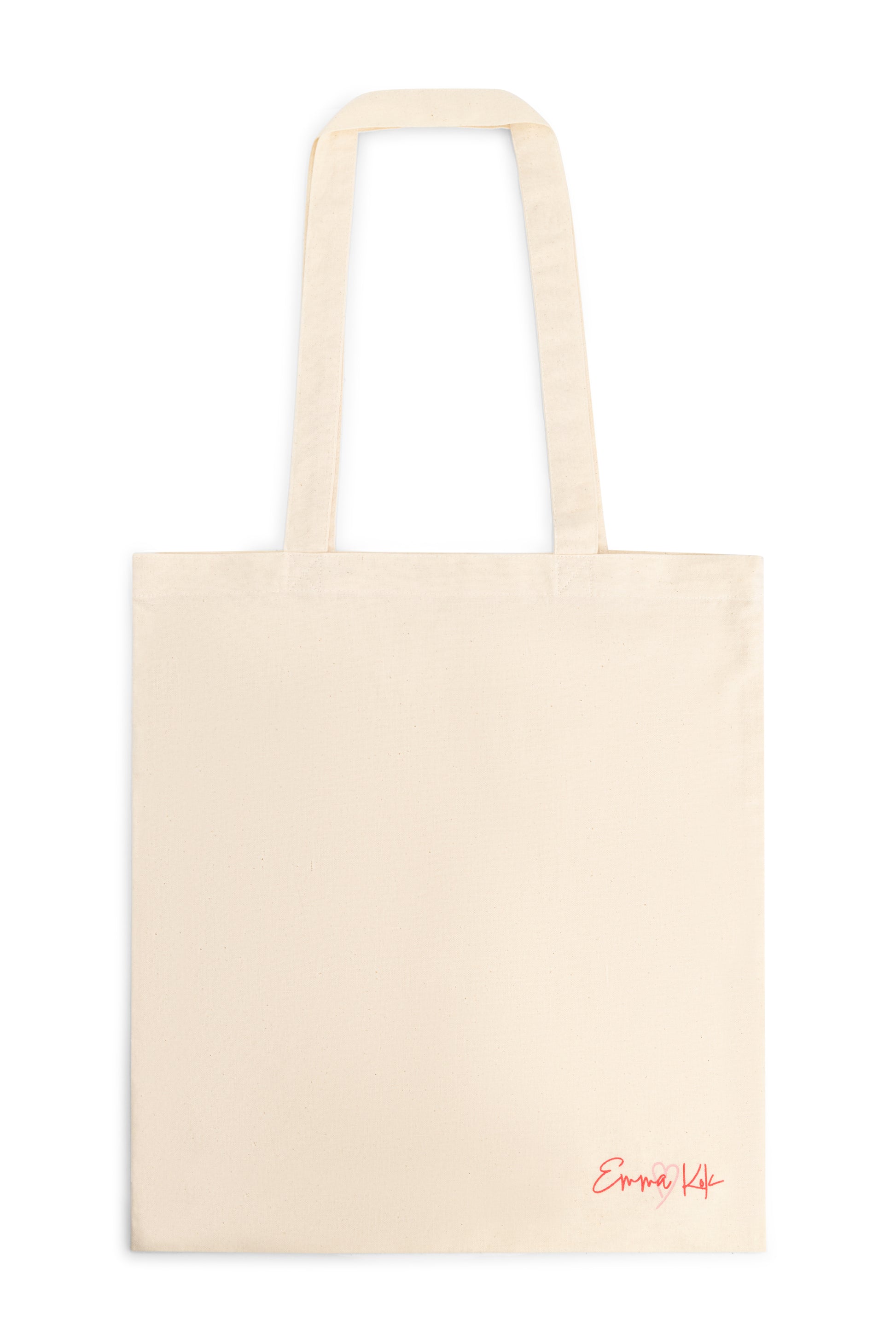 This totebag is made of 100% cotton. It is top edge double folded for extra strenght and has long handles with reinforced cross stich. On the front you will find Emma's logo and on the back you will see a huge hart! This totebag is now available in a first exclusive limited drop in three colors pink, natural raw and black. So order now!